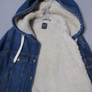Keywords: GAP denim jacket, womens denim jacket, sherpa lined jacket, hooded denim jacket, blue jean jacket, trucker jacket, small denim jacket, GAP coat, denim coat, casual jacket, fall jacket, winter jacket, cropped denim jacket, medium indigo