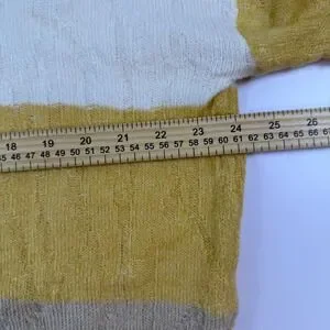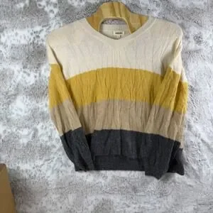 Stylish sweater featuring a unique colorblock design. This V-neck pullover boasts horizontal stripes in cream, yellow, beige, and gray. Crafted with comfort and style in mind, it offers a relaxed fit and a soft feel. Perfect for casual outings, layering on cool days, or adding a touch of color to your everyday wardrobe.