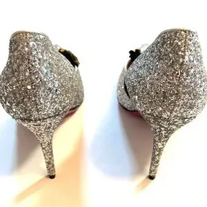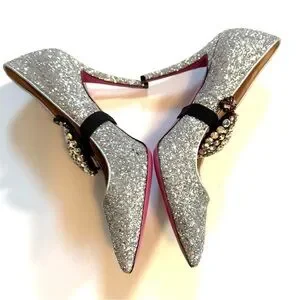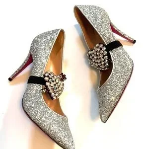 These heels are cratted of nappa silk with an overlay of silver glitter and are adorned by removable crystal hearts. These super chic heels have a 4 inch sharp stiletto, a pointed toe and have pink soles. These are stylish heels with a distinctive look