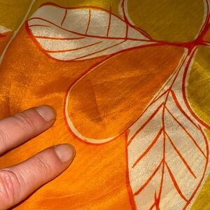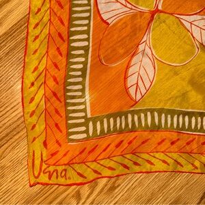 Gently cherished 1980s vintage sheer floral Vera Neumann 26” square Scarf in orange and chartreuse green. Silk / rayon blend. No snags. See last photo for closeups of two very small stains (you may need to enlarge photo to see them).