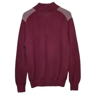 Cozy Weatherproof Vintage men's quarter zip sweater in a rich burgundy tone with a classic Fair Isle knit pattern across the chest. Features a ribbed stand collar, quarter zip closure, long sleeves and ribbed cuffs and hem. Labeled "The Holiday Sweater" for festive seasonal style. Made from 100% cotton for breathable warmth and comfort. Size Large.