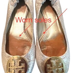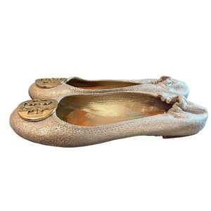 Tory Burch Reva Ballet Flats Metalli Gold Crackle Leather Logo Medallion Size 7M