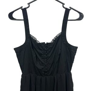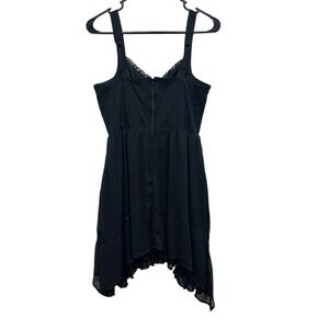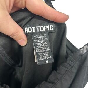 Keywords: black dress, sleeveless dress, lace trim dress, asymmetrical hem dress, Hot Topic dress, gothic dress, women's dress, party dress, casual dress, ruffled neckline, corset style dress