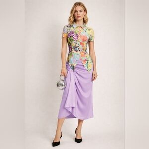 Make a bold, fashion-forward statement with this Kenzo silk floral top, crafted in a vibrant multicolor botanical print that embodies the brand’s iconic artistic edge. Designed with a tailored, corset-inspired silhouette, this piece features short sleeves, a classic collar, and a dramatic split hem that creates a flattering, sculpted fit.