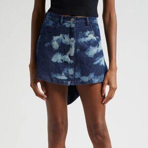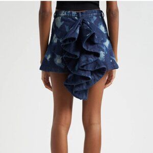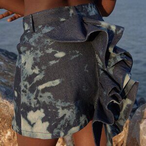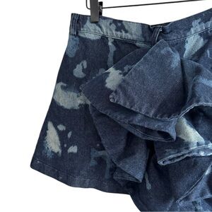 Swatches of blue splash atop heavy-weight nonstretch denim on this weekend-ready miniskirt completed voluminous ruffles that cascade down the centre back.