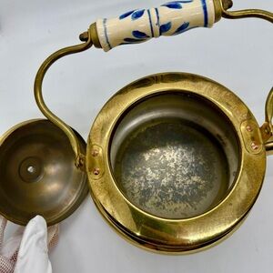 antique brass kettle, vintage teapot, porcelain handle, blue white floral, stovetop water boiler, rustic farmhouse kitchen decor, collectible brassware, globe tea kettle, metal teapot, decorative kettle, unique brass pot