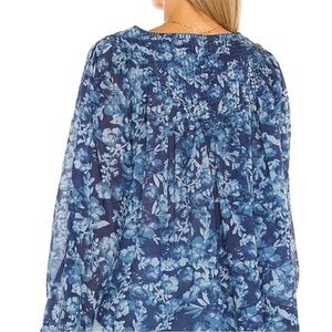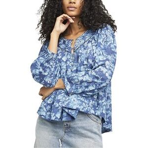 A feminine blue floral print pairs perfectly with delicate embroidery, exaggerated sleeves and flowy silhouette with this beautiful cotton top from Free People.