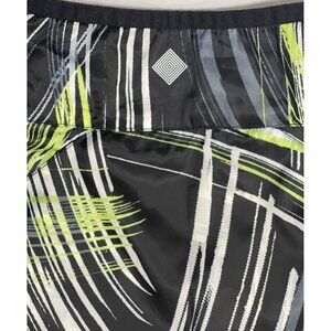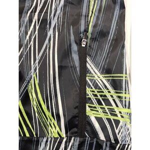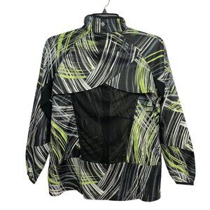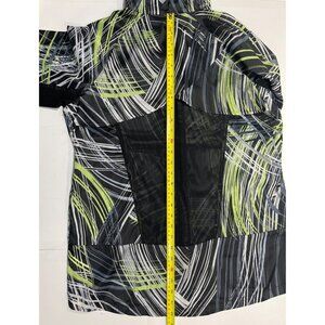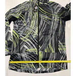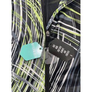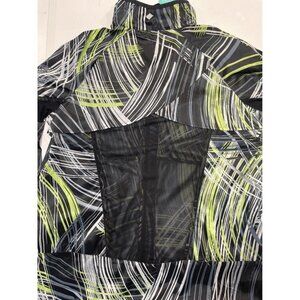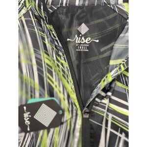 RISE by LuLaRoe ~ Determined Athletic zip up jacket. Women's size small. Black, lime, grey, and white in an 80's style pattern. Lightweight full zippered jacket with front slant zippered pockets. High-low hem. Power mesh back ventilation with storm shield. Super lightweight.
