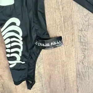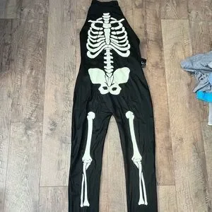 Black jumpsuit with skeleton print. Eye-catching and bold design. Perfect for a unique look.