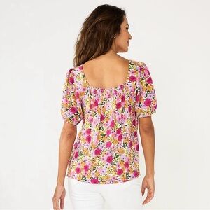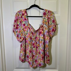 Women’s Draper James RSVP top. Square neck with elastic in the back. Puff sleeves with elastic around the ends. Looser flowing fit with a lining. Pink and purple floral print. Size 2X. Only worn a couple times. 100% rayon.