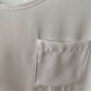 Reitmans off-white blouse top in size medium. One chest pocket at left. Keyhole at back. Scoop hi-lo hem. Loose, relax fit. Slightly see-through, sheer. Likely polyester. Pairs well with jeans.