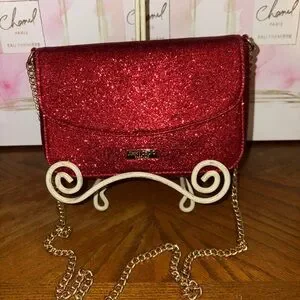Dazzling red clutch with glitter finish, perfect for your holiday outfits! Features a chic chain strap. 🎄🎅🏻
