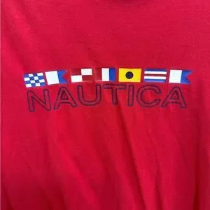 Bold red tee with Nautica logo and flag design. Ideal for casual wear.