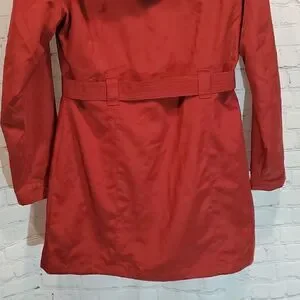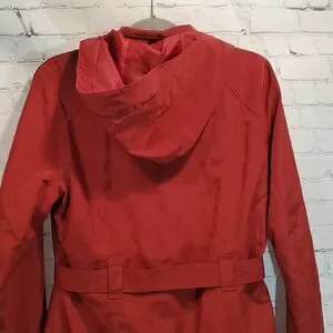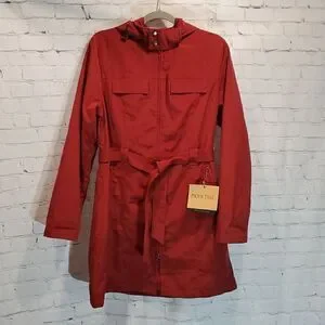 New with tag no flaws. Burgandy in color lighter weight with removable belt. Detacable hood and 4 front pockets. Armpit to armpit measures about 20 inches and it is 35 inches long.