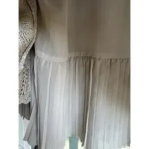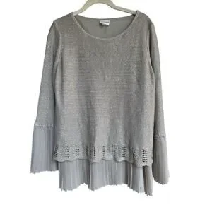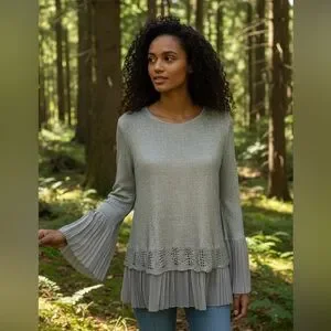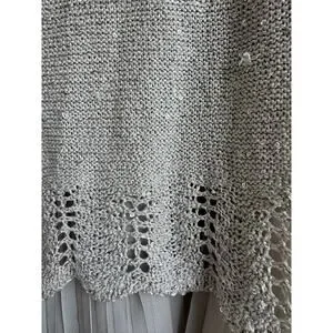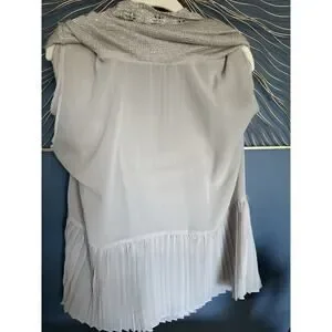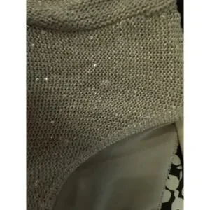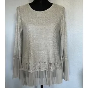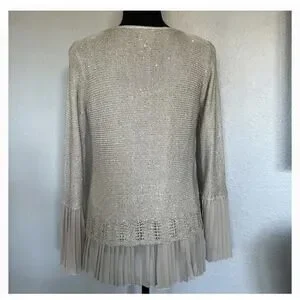 The Sioni Women’s Large Sequin Layered Pleat Trim Pullover Sweater in a neutral Beige is a stylish and trendy piece. The sequin accents add a touch of sparkle and the twee pop character gives it a playful and fashionable edge. Cute pleat details.