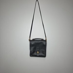 The Vintage Coach Crossbody Satchel in Medium size is a square-shaped dark green leather bag with a buckle and turn lock closure. It features black leather handles with gold hardware accents and a detachable strap. This versatile bag is suitable for various occasions including travel, weddings, party/cocktail events, casual outings, formal events, work or business meetings. The handcrafted bag also includes inner pockets, a matte finish, and is perfect for those who appreciate timeless, classic style with a hint of retro and hipster flair. Perfect for those who love unique and unique accessories that add a touch of vintage charm to their wardrobe.