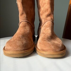 Materials: Crafted from high-quality chestnut suede with a sheepskin insole for comfort. Unlike many other UGG models, these often feature a fabric-lined shaft rather than a full shearling interior.