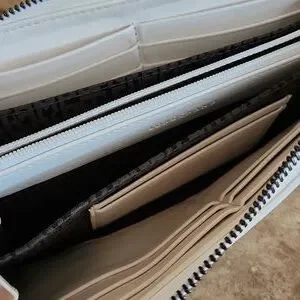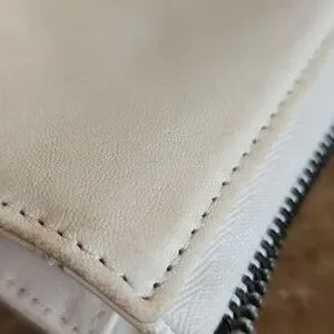 Elegant white leather wallet featuring an embossed logo and a zip around closure. Perfect for a sleek and stylish look.