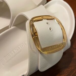 Elegant white sandals with bold gold buckle. Perfect for casual wear. Rubber sandals