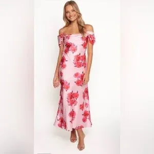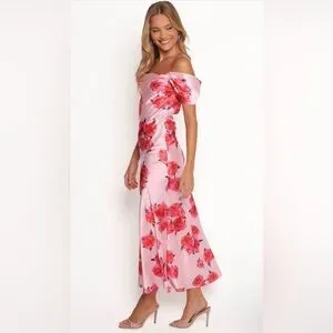 Floral off-shoulder dress. Perfect for any occasion, this pink dress features a beautiful floral pattern that adds a touch of femininity. Ideal for making a statement.