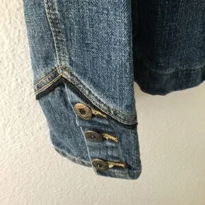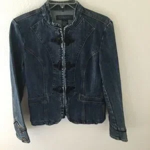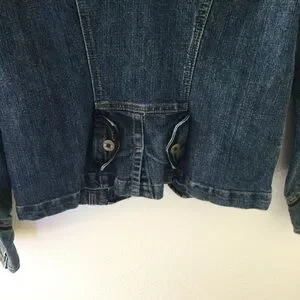 Baccini dark denim zip jacket in a size medium. This jacket is so detailed. Has two pockets in the front has buttons on the sleeves and the back of the jacket. measures approximately 19 inches across the chest from under arm to under arm. measures approximately 13 inches from under arm to the bottom of the jacket. Jacket is an excellent condition.