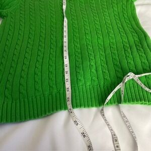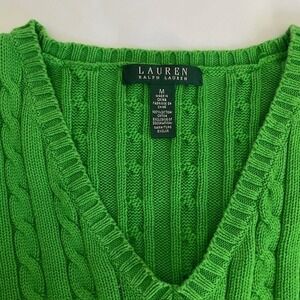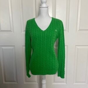 Tags: Lauren Ralph Lauren, women's sweater, green cable knit, cotton pullover, classic v-neck, preppy style, embroidered logo, casual chic