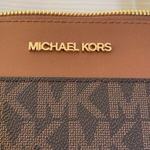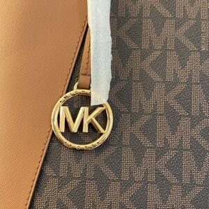 This Michael Kors tote features a stylish structured design in rich brown/Luggage coated canvas with a darker brown monogram pattern. It is equipped with sturdy handles and a gold-toned charm, making it a chic choice for everyday use.