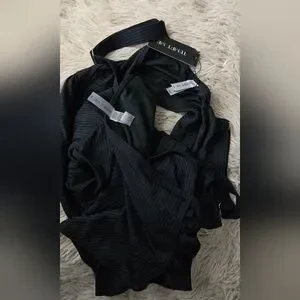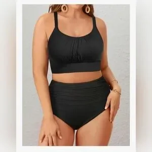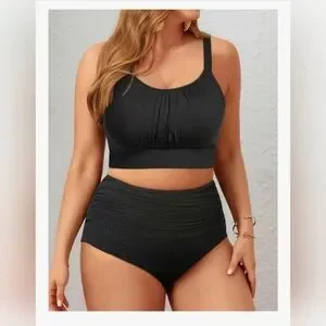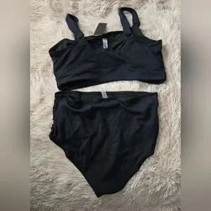 •This black plus size two-piece swimsuit boasts a ribbed texture that adds a touch of sophistication and visual interest, enhancing the overall aesthetic with its intricate lines.