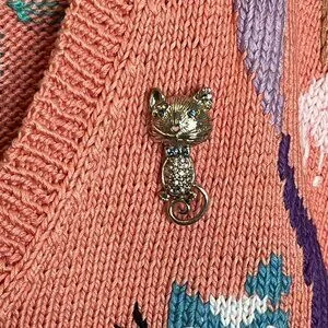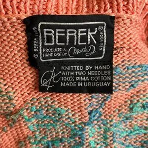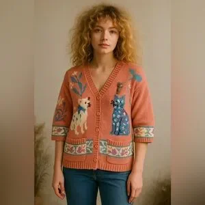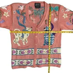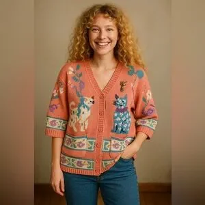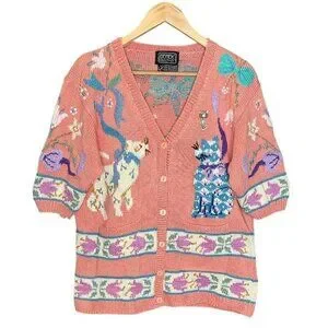 Hand-knit 100% pima cotton Berek (Made in Uruguay). Heavy, high-quality vintage yarn with bold cat and floral designs, button front, and two pockets. Includes vintage cat brooch (two tiny stones missing—not noticeable). No stains or smells. Hand-washed and dried flat. Minor yarn irregularities expected in hand knits; overall excellent vintage condition.