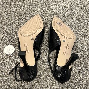 Chic black slingback heels with a textured finish. Ideal for adding elegance to any outfit.