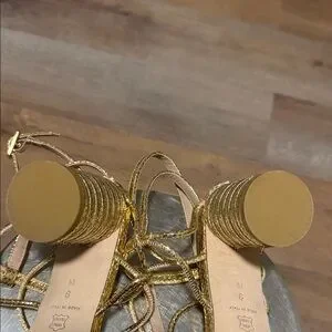 Pre-owned Elegant gold strappy heels with a sturdy block heel. Perfect for adding a touch of glamour, the heel height is 3-inches