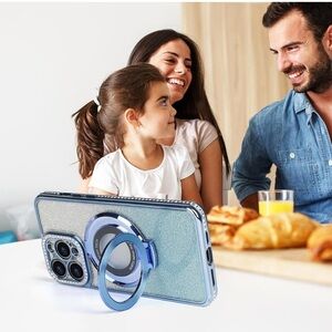 iPhone 15 pro Max Enhance your phone with this luxury glitter case featuring a convenient ring holder. The silver and blue design adds a touch of elegance and style.