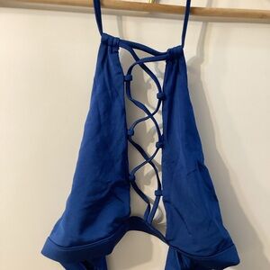 Stylish blue one-piece swimsuit with strappy back design. Perfect for beach days.
