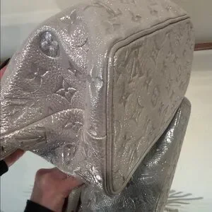 Stylish Louis Vuitton hobo bag in metallic silver. Features iconic monogram pattern. Includes elegant tassel detail.