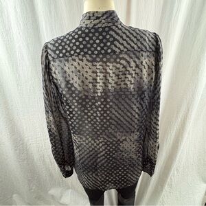 Design: Features a pussybow tie at the neck, a subtle black, beige and beige grey polka dot pattern, and long sleeves with buttoned cuffs