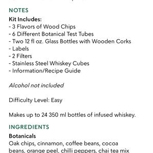 • To start, supply your own vodka (when it's made from grains, it's essentially the same as unaged whiskey), then use the included recipe guide to mix your own custom blend of infusion ingredients.