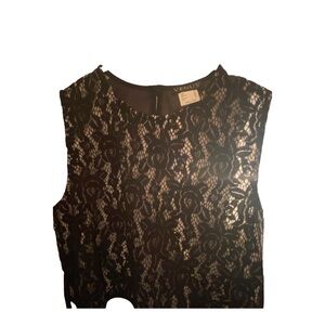 This sophisticated sleeveless blouse by VENUS features a striking black lace overlay with intricate patterns, beautifully contrasted by a flowing white fabric. The elegant design is perfect for both casual outings and formal events, offering a chic and versatile addition to your wardrobe.