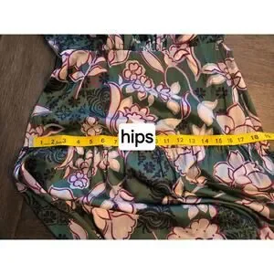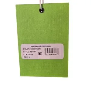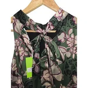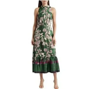 The dress features a vibrant, bandanna-inspiroral print in shades of green, ivory, and purple. It is designed with a mock halter neck that ties at the back, a sleeveless silhouette, and a tiered skirt for added movement.
