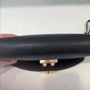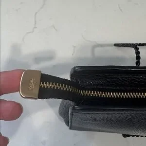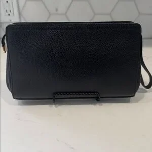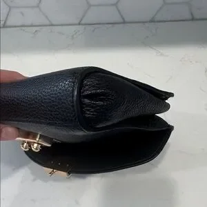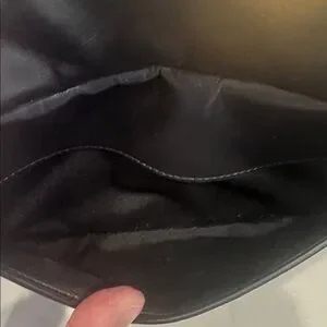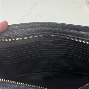 Excellent condition, inside is pristine, no callouts. The hardware is in great condition. Approximately 10 x 6, has a 6” wristlet strap as well.