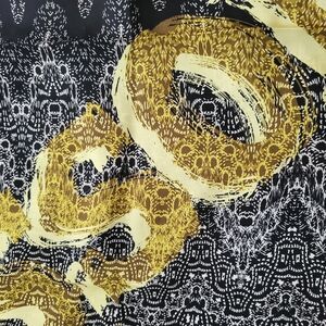 New with tag! Made in Italy, square silk scarf in black & white abstract print with diagonal yellow & olive designer name branding. Dry clean. Measures approx 35" x 35".
