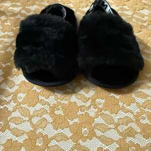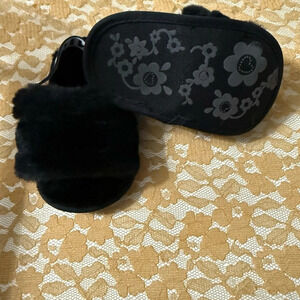 New Black faux fur infant slides with elastic band. Has soft bottom (crib shoes). Say “nice” on the elastic bands