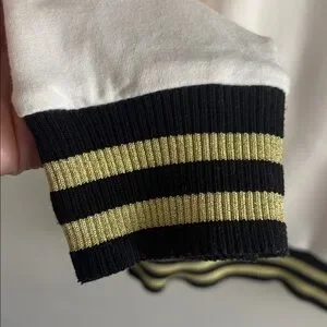 Cream knit top with gold and black stretch detailing.