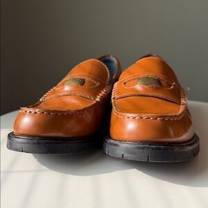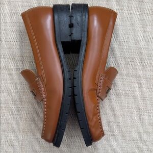Slip-on style, classic loafer construction, round toe, tread rubber outsole, penny slot detail, coin accent