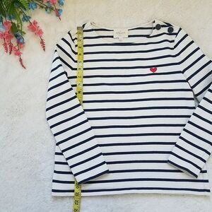 In excellent condition, nautical, light cream with navy blue stripes, embroidered red heart on front-great for Valentine's Day, 2 blue buttons at shoulder, no material tag but it is 100% organic cotton, size XXS.