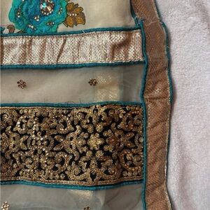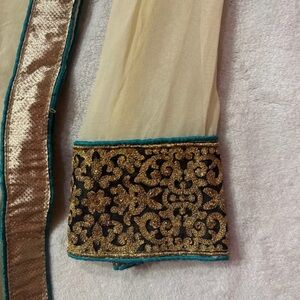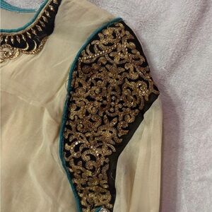 Beautiful cream dress with intricate blue floral embroidery and gold accents. Perfect for special occasions.