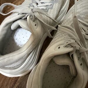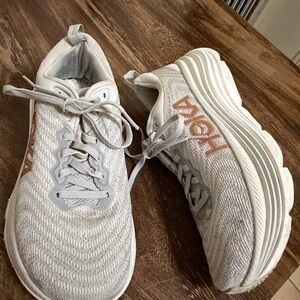 Hoka shoes with a cute comfy design. Bronze accents add style. Ideal for running.no insoles , first pic from google not the color