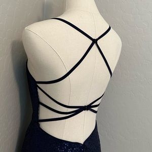 Gorgeous! 💫💫💫 Navy Blue Sequin Formal Cocktail Dress. Padded Bra, Front Thigh Zip (9.5”) Open Strap Back, Zip & Hook. It’s Exquisite! ✨🌹✨