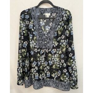J Jill Black Floral V Neck Sheer Tunic Top Blouse Button Down Womens Size L