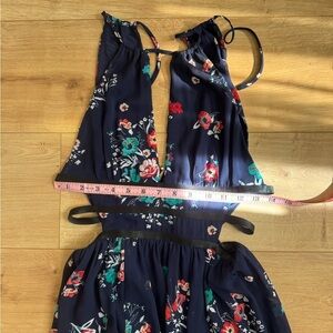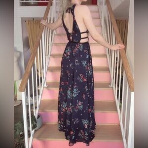 Open back Maxi dress. Navy blue with red and teal floral print. Features satin elastic waist band detail and ties in the back.