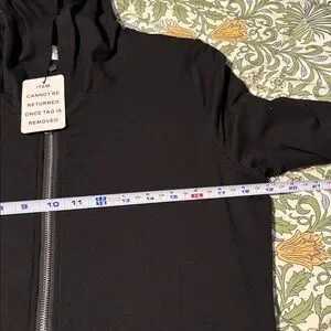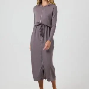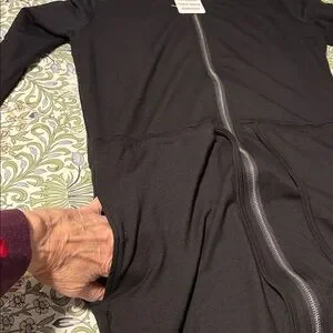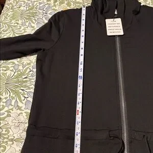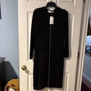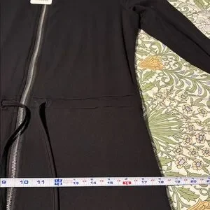 Super cute soft cotton knit dress that zips in both directions. Has pockets and a hoodie. I included measure from waist to shoulder so you can determine how much it will blouse in the chest area. Meant to be a little blousy. It is a little small in the chest for me…darn. So cute and super soft! Measures in photos. Black is sold out online.